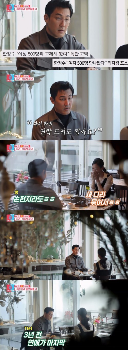 상대 여성은 “기사를 찾아봤더니 이성을 500명 만났다는 이야기가 있더라”면서 사실인지 물었다. 한정수는 당황하더니 “좀 과장된 것”이라고 했다.