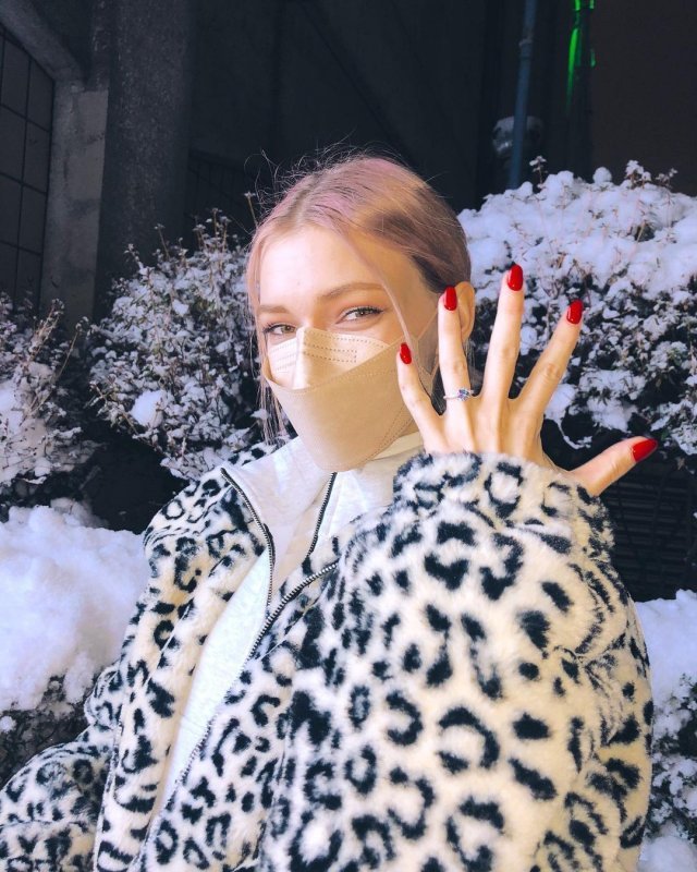 공개된 사진 속에는 스테파니 미초바와 빈지노가 얼굴을 맞댄 채 미소 지은 모습이 담겼다. 스테파니 미초바는 왼손 네 번째 손가락에 낀 다이아몬드 반지가 눈길을 사로잡는다.
