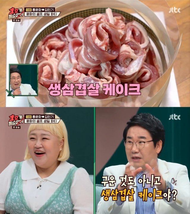 수제 케이크의 정체는 바로 생삼겹살 케이크였다. 이에 홍윤화는 감동하며 “저는 너무 좋았다”라고 얘기해 눈길을 끌었다.