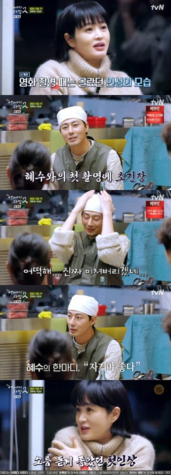 12일 오후에 방송된 tvN 예능 프로그램 ‘어쩌다 사장2’에서는 특급알바 3인방 김혜수, 박경혜, 한효주와 함께 회포를 푸는 차태현, 조인성의 모습이 담겼다.