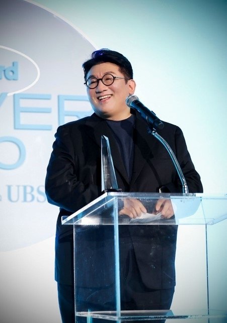 방시혁 하이브 의장이 빌보드 파워 100 시상식에서 클라이버 데이비스 비져너리 상(Clive Davis Visionary Award)을 수상했다.