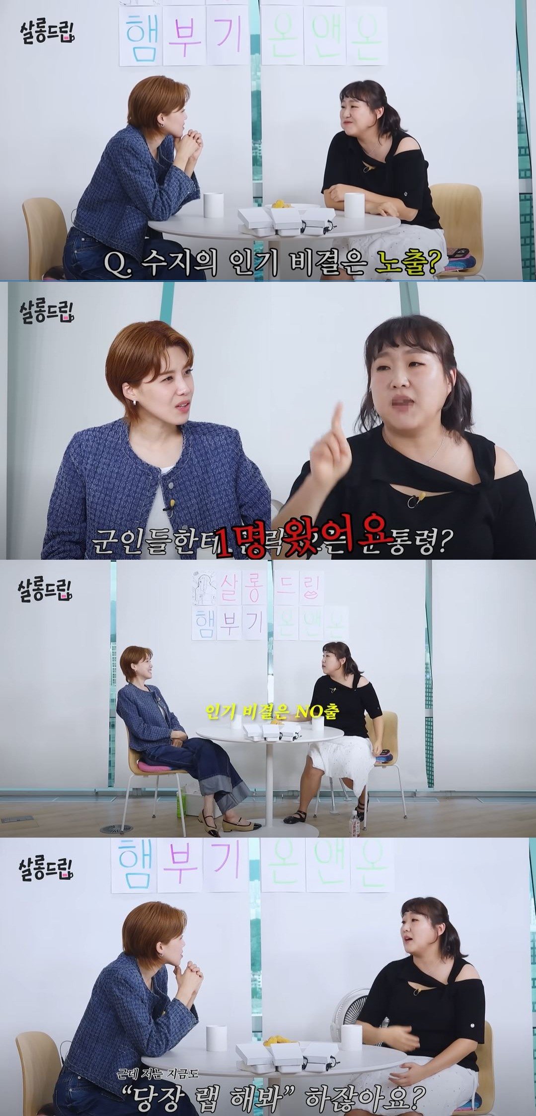 이날 장도연은 “요즘 이수지 인기가 심상치 않다. 노출이 인기 비결이냐”며 “‘군통령’이라더라. 군인들한테 메시지도 많이 받는다면서?”라고 물었다.