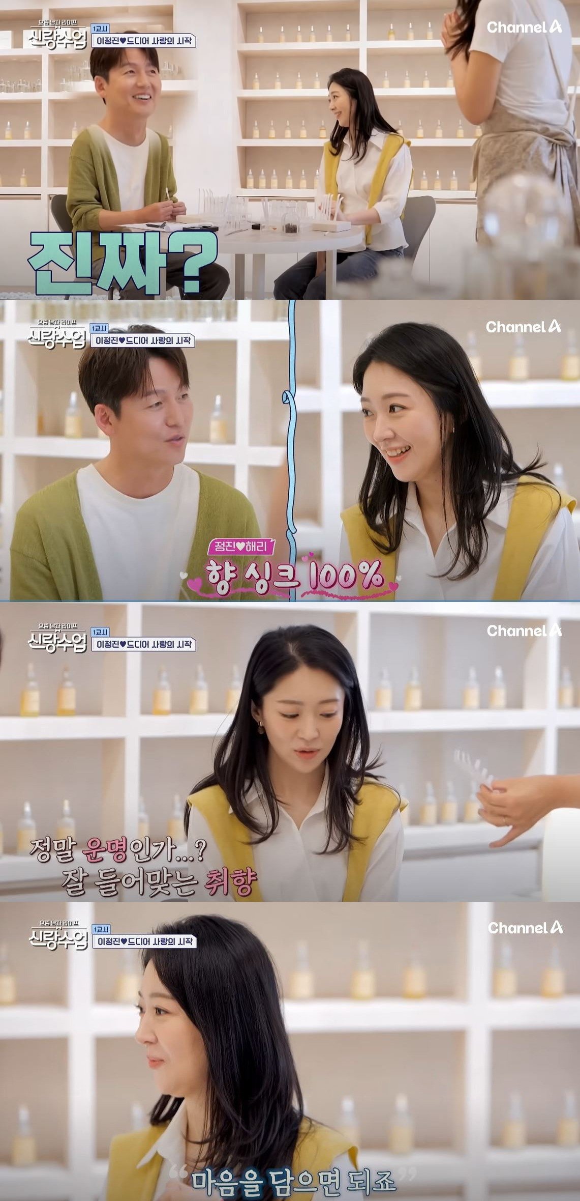 이정진이 향을 고르던 중, 박해리 역시 같은 향을 집어 들었다. 이정진은 놀란 듯 “내가 그 향을 먼저 들고 있었다. 이런 경우가 있냐”고 웃었고, 조향사도 “두 분이 같은 향을 고른 건 정말 드문 일”이라며 미소를 지었다.