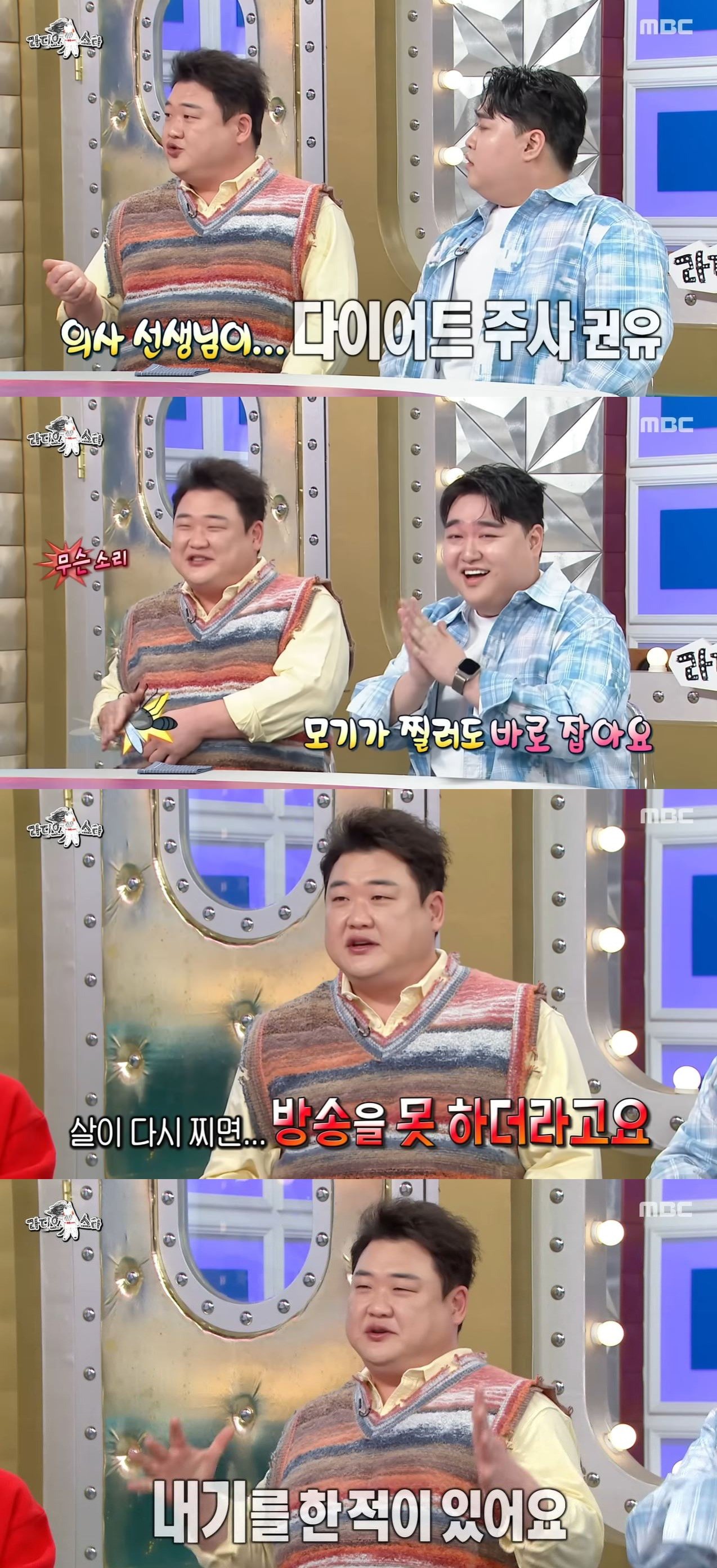 앞서 김국진은 “최근에 0.1톤이 되려다가 실패했다더라”라고 말했다. 김준현은 “의사 선생님이 다이어트 주사를 권유하셔서 한 번만 해보겠다 했는데 바늘을 못 찔렀다”고 했다.