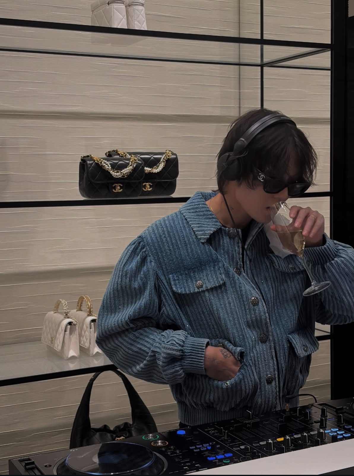 사진 속 던은 차분한 분위기 공간에서 헤드셋을 착용한 채 음향 장비 앞에 서거나, 소파에 편안히 앉아 카메라를 응시하고 있다. 선글라스를 끼고 파랑 텍스처 재킷과 검은 가죽 팬츠를 조화시킨 스타일링은 고급스럽고 세련된 매력 및 강렬함까지 선사하고 있다.