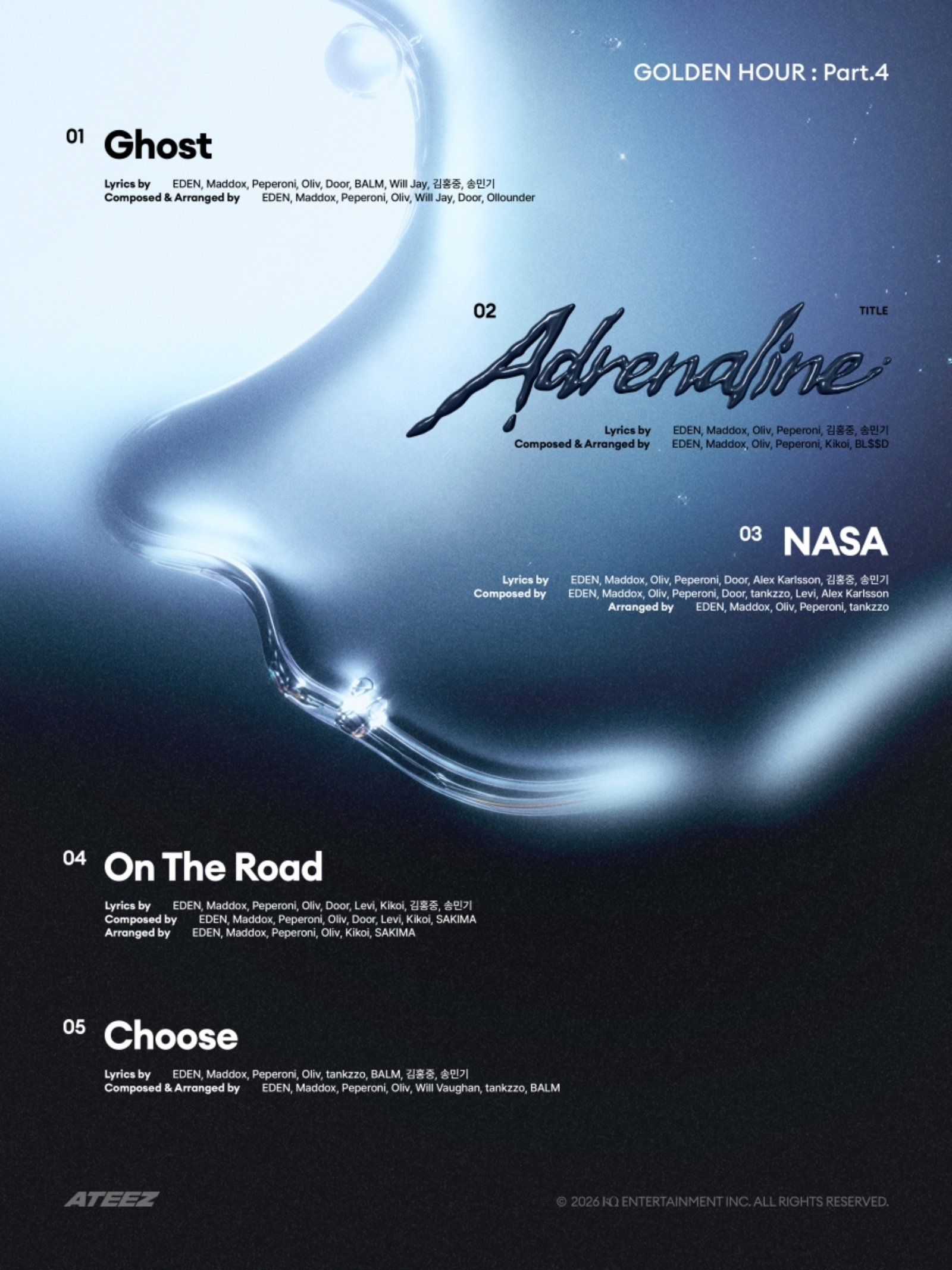 트랙리스트에 따르면 에이티즈의 새 앨범 타이틀곡은 ‘아드레날린(Adrenaline)’이다. 이 외에도 ‘고스트(Ghost)’, ‘나사(NASA)’, ‘온 더 로드(On The Road)’, ‘츄즈(Choose)’까지 총 5곡이 수록돼 ‘골든 아워’ 시리즈의 빛나는 서사를 이어갈 예정이다.