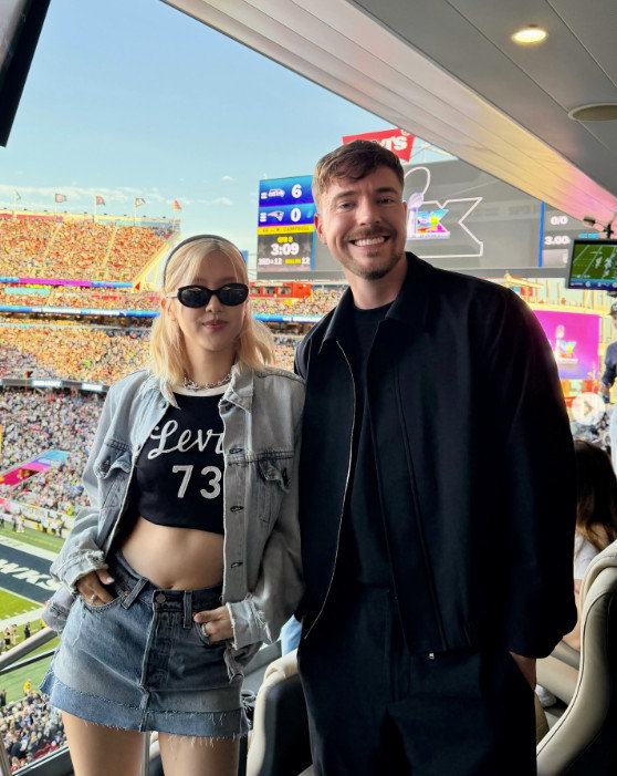 사진 속에는 이날 미국 캘리포니아주 샌타클래라 리바이스 스타디움에서 열린 미국프로풋볼(NFL) 시애클 시호스크와 뉴잉글랜드 패트리어츠의 제60회 NFL 슈퍼볼 현장을 찾은 로제와 미스터비스트의 모습이 담겼다. 두 사람은 서로 옆에 두고 환한 미소를 짓고 있다.
