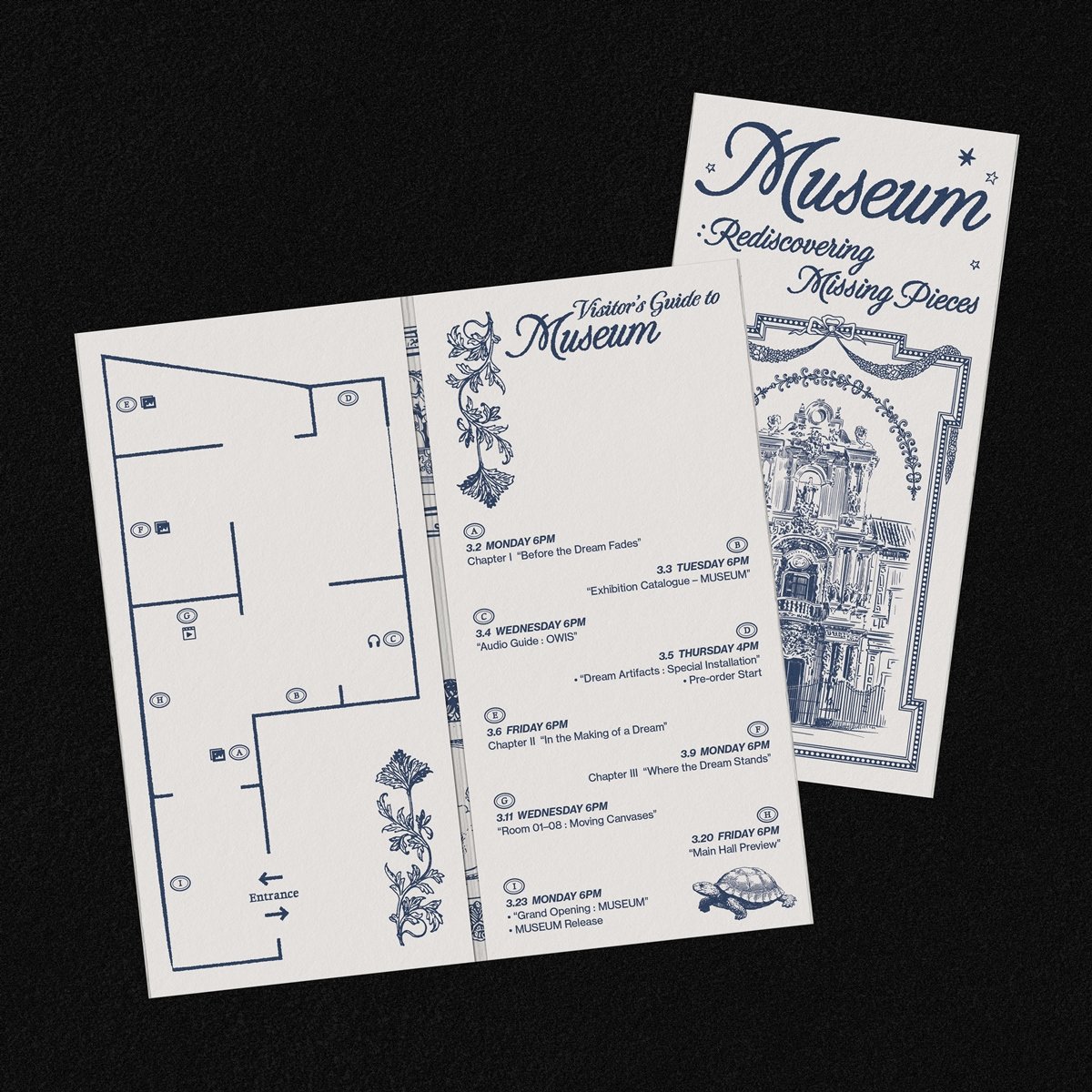 이번 스케줄러 이미지는 관람객들을 안내하는 리플릿 형태로 앨범명 ‘MUSEUM’과 연결되는 재치 있는 구성이 눈길을 끈다. 박물관 가이드 북을 연상시키는 감각적인 디자인은 앞서 공개된 ‘기억의 박물관’으로 초대하는 트레일러 영상, 티켓 형태의 커밍순 포스터와 이어지며 팬들의 폭발적인 반응을 이끌어내고 있다.