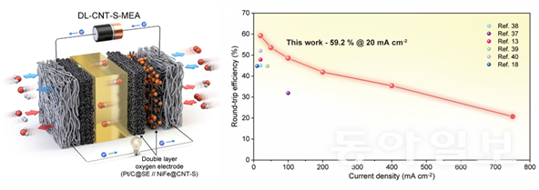 실험 결과, 에너지 전환 효율(round-trip efficiency)은 59.2%로 세계 최고 수준을 기록했다. 또한 높은 전류밀도 조건(750mA cm⁻²)에서도 효율을 보이며 구동 가능성을 확인했다.