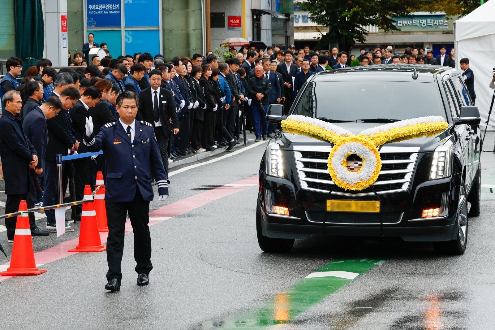 김건희 여사의 각종 의혹을 수사 중인 민중기 특별검사팀의 조사를 받은 후 숨진 양평군 단월면장의 영결식이 열린 14일 경기 양평군청에서 고인의 운구차가 이동하고 있다. 2025.10.14/뉴스1