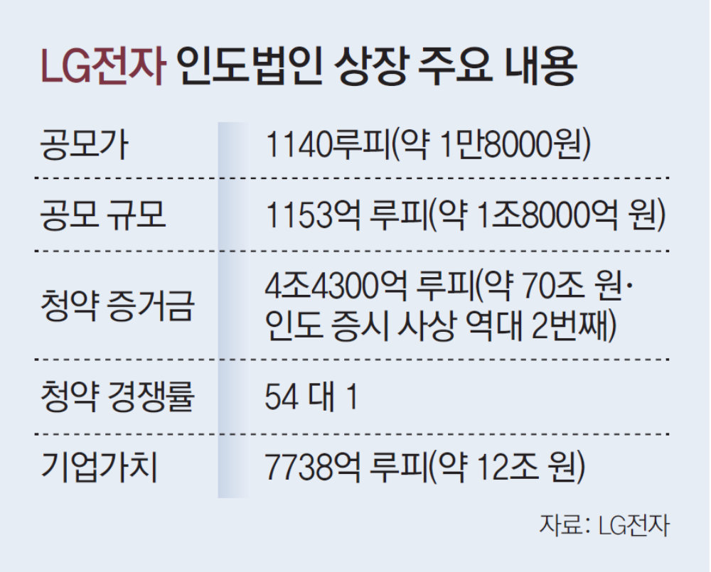 LG전자 인도법인의 공모주 규모는 1153억 루피(약 1조8000억 원)로, 청약 증거금만 4조4300억 루피(약 70조 원)가 몰렸다. 이는 인도 증시에서 2008년 릴라이언스파워 기업공개(IPO) 이후 2번째 규모로, 청약 경쟁률이 54 대 1까지 치솟았다.