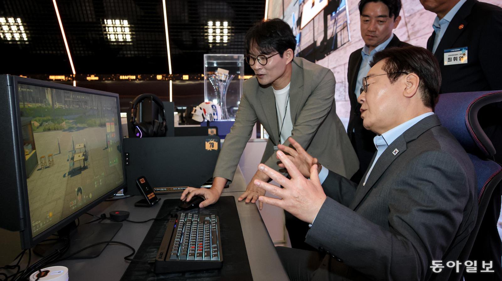 이재명 대통령이 15일 서울 성동구 펍지(PUBG) 성수에서 열린 K게임 현장 간담회에 앞서 게임사 크래프톤의 신작 게임인 ‘인조이’를 체험해 보고 있다. 송은석 기자 silverstone@donga.com