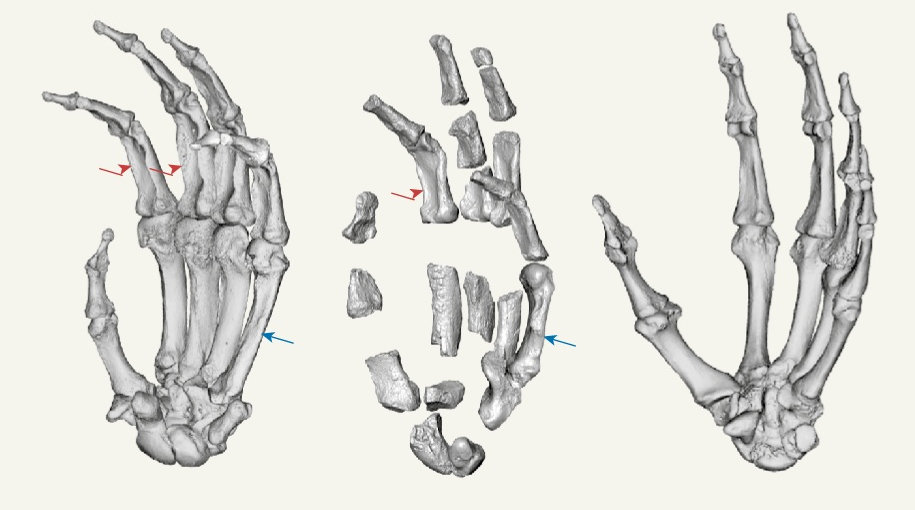 왼쪽부터 현대 고릴라, P. 보이세이, 현대 인류의 손뼈 모습. P. 보이세이의 손뼈는 현대 인류 및 고릴라와 유사한 특징을 지닌다. 네이처 제공
