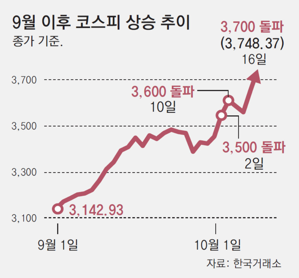 코스피는 9월 10일 3,300 선을 돌파해 4년 2개월 만에 최고점을 넘긴 뒤 3거래일 만인 9월 15일 3,400을, 그 후 13거래일 만인 이달 2일 3,500을 넘겼다. 다시 1거래일 만에 3,600의 벽을 허물더니, 4거래일 만인 이날 3,700도 넘어섰다. 코스피는 9월부터 17% 넘게 성장했다.