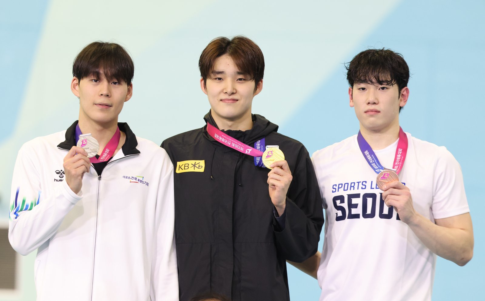 18일 부산 동래구 부산사직종합운동장 실내수영장에서 열린 제106회 전국체육대회남자 경영 남자 일반부 자유형 1500m 시상식에서 1위를 차지한 김우민(가운데, 강원도청)와 2위를 차지한 김영현(왼쪽, 전주시청), 3위를 차지한 조승빈(서울시청)이 기념촬영 하고 있다. 2025.10.18 [부산=뉴시스]