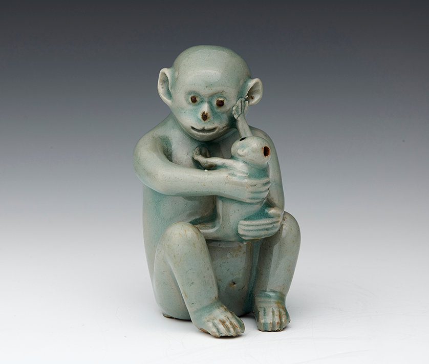 새끼 원숭이의 작은 손가락이 어미의 뺨을 어루만지고 있다. 두 팔로 새끼를 받쳐 안은 어미의 표정에서는 온화한 사랑이 묻어난다. 12세기 제작된 ‘청자모자원숭이형연적’(국보)은 남아 있는 고려청자 가운데 흔치 않은 원숭이 모양으로, 몸통의 맑은 비색과 철채로 표현된 이목구비가 아름다운 작품이다.