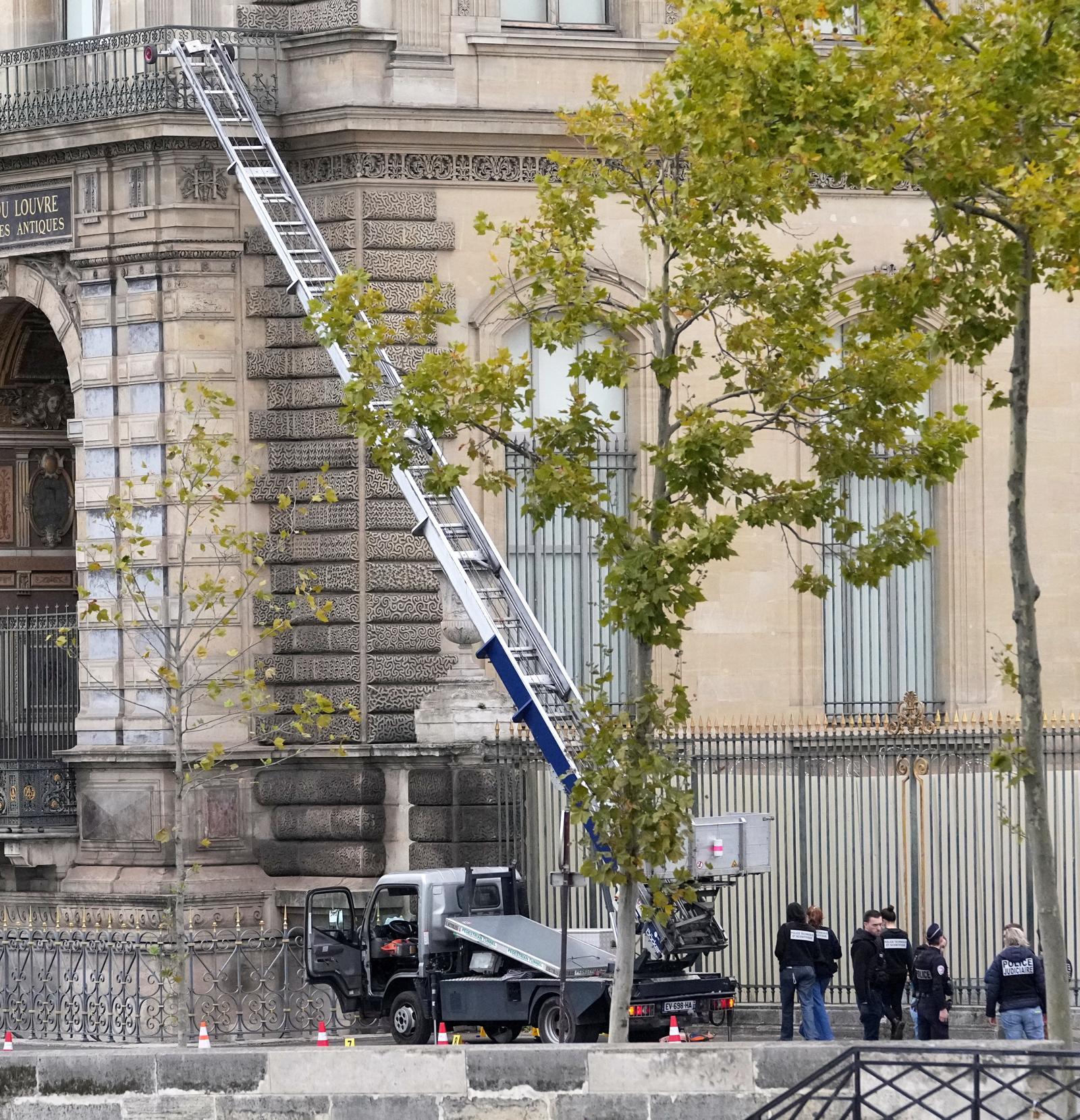 19일 프랑스 파리의 루브르 박물관에서 나폴레옹 3세의 부인 외제니 황후의 왕관 등 8점의 왕실 보물을 훔친 범인들이 사용한 사다리차를 경찰이 조사하고 있다. 파리=AP 뉴시스