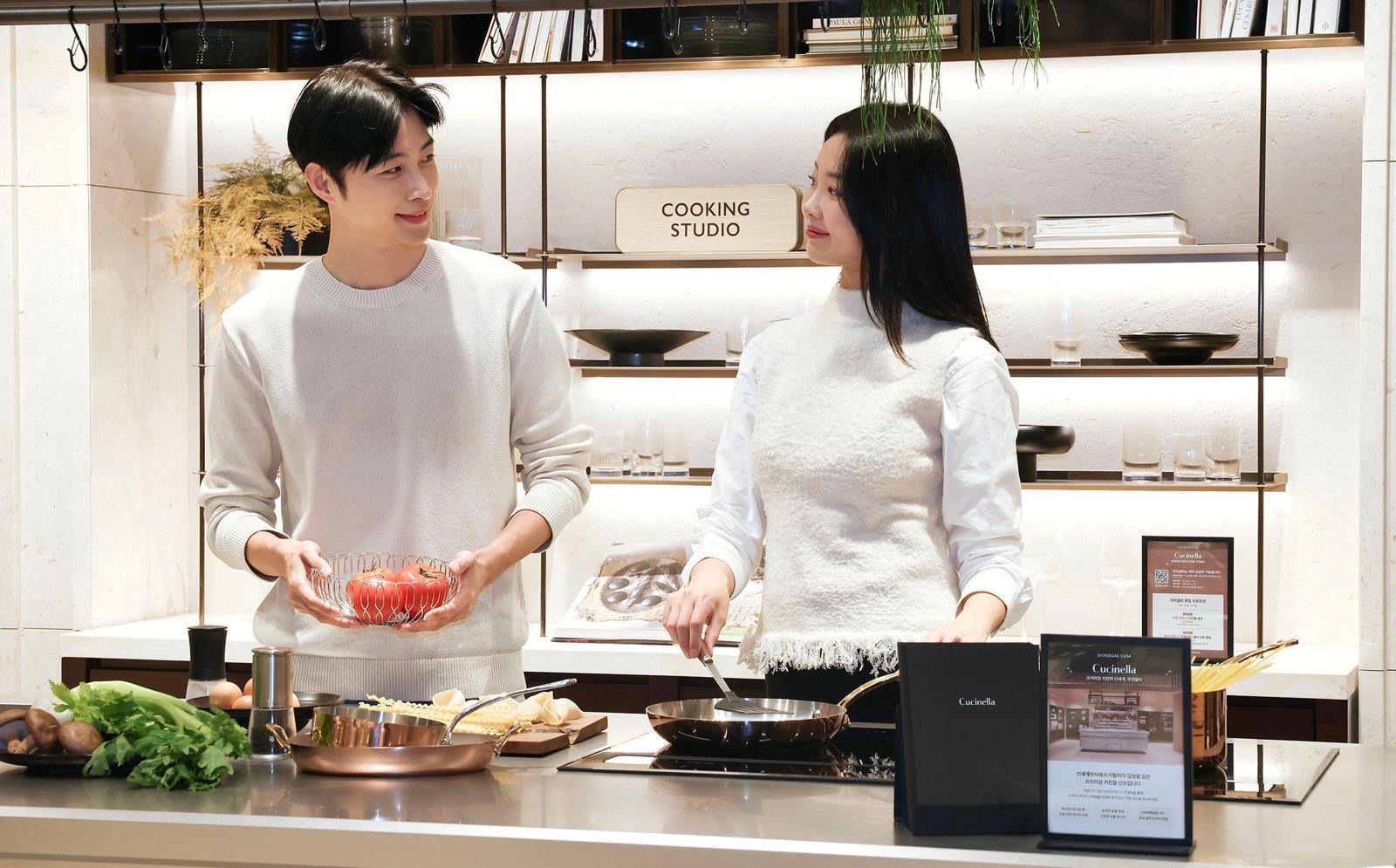 21일 서울 서초구 신세계백화점 강남점에서 모델들이 하이엔드 커스텀 주방가구 ‘쿠치넬라’ 매장을 소개하고 있다. 쿠치넬라는 신세계까사가 선보이고 있는 맞춤 주방가구 브랜드로, 유럽 브랜드의 고급 자재를 활용해 고객 맞춤형 주방을 제공한다.
