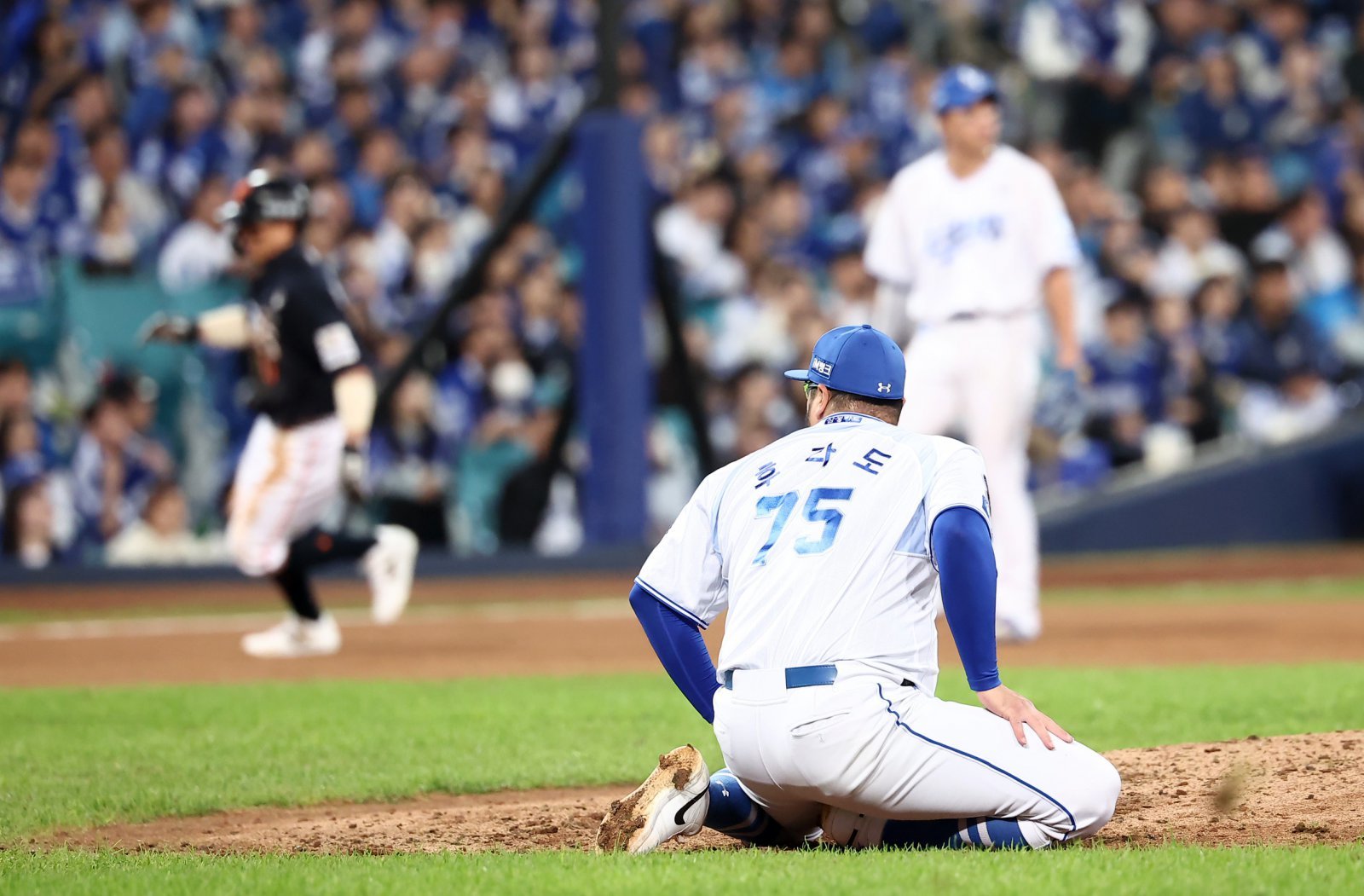 21일 대구삼성라이온즈파크에서 열린 2025 신한 SOL뱅크 KBO 포스트시즌 플레이오프 3차전 한화 이글스와 삼성 라이온즈의 경기, 삼성 선발 후라도가 5회초 1사 2루 한화 리베라토에게 1타점 2루타를 허용하며 투구 후 넘어지고 있다. 2025.10.21/뉴스1