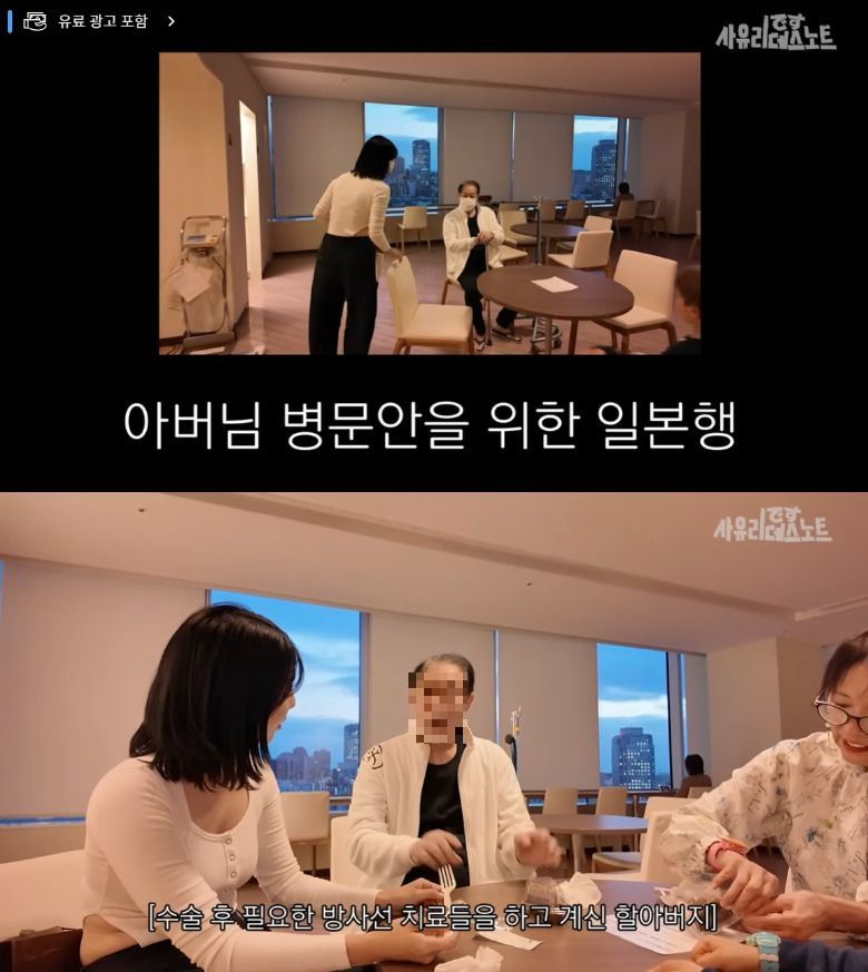병상에 누워 있던 사유리 아버지는 “괜찮다. 두 가지 치료를 받고 있다”며 수술 이후 방사선 치료를 병행 중이라고 밝혔다.