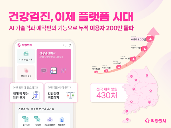건강검진 플랫폼 ‘착한의사’가 누적 이용자 200만 명을 돌파하며 성장세를 이어가고 있다. 코로나19 이후 개인 건강관리에 대한 관심이 높아진 가운데, 특히 30~40대 여성층의 이용 증가세가 두드러지며 국내 대표 검진·건강관리 플랫폼으로 자리매김했다는 평가다.