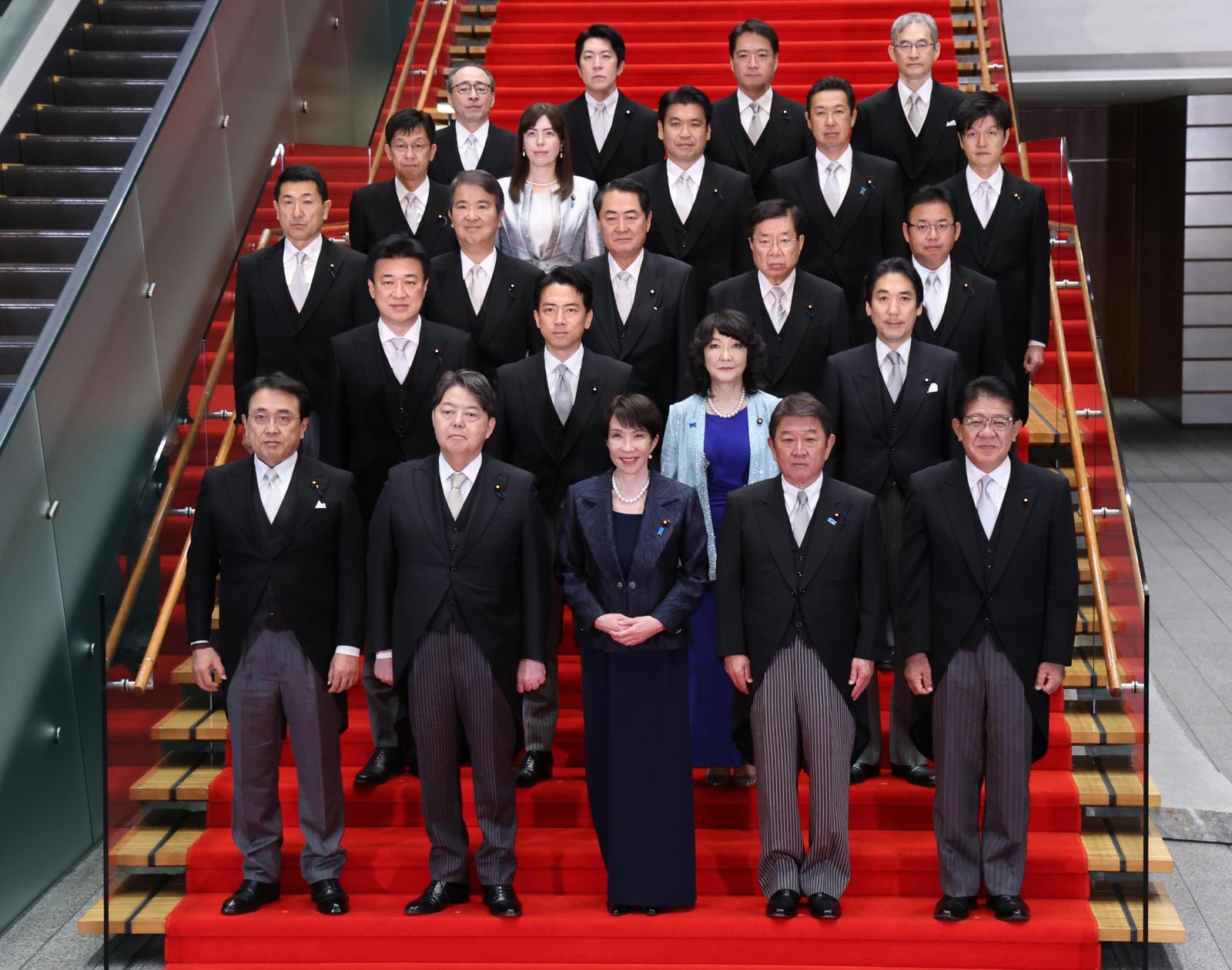 21일 일본 최초의 여성 총리에 오른 다카이치 사나에 총리(앞줄 가운데)가 같은 날 도쿄 총리 관저에서 각료들과 첫 회의를 마치고 기념사진을 찍고 있다. 아사히신문 제공