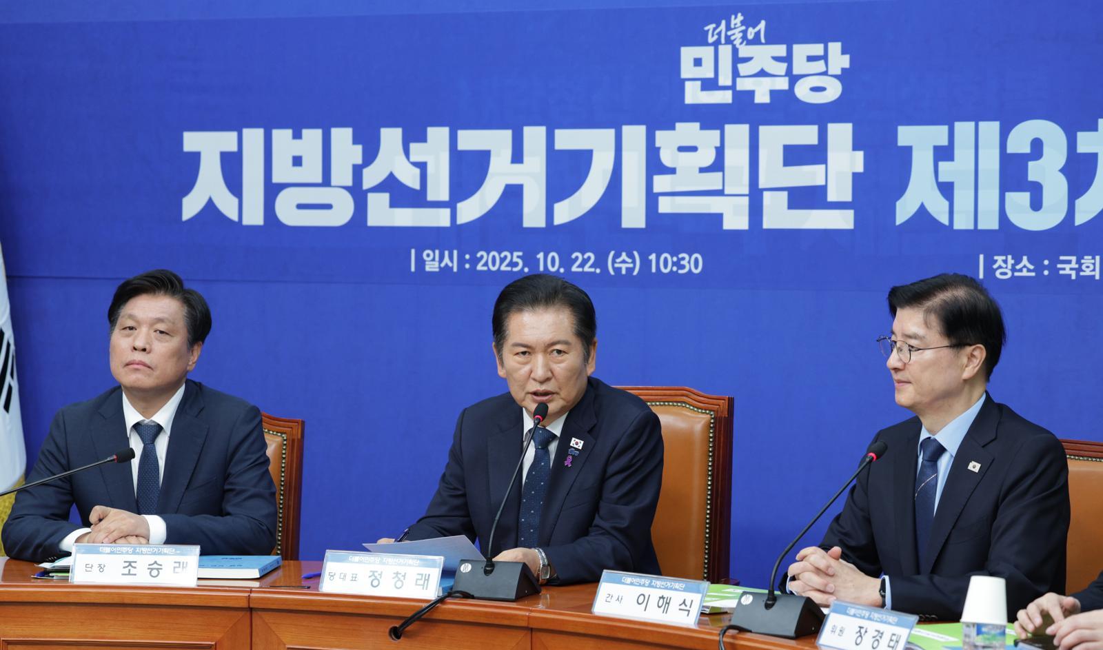 정청래 더불어민주당 대표가 22일 서울 여의도 국회에서 열린 지방선거기획단 3차 회의에서 발언하고 있다. 2025.10.22/뉴스1