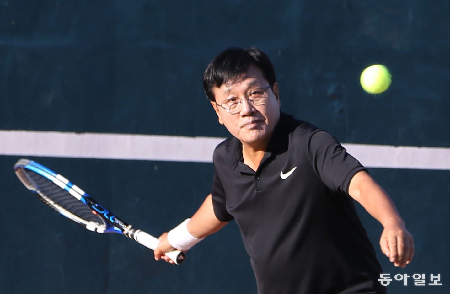 박상순 지앤비에스 에코 회장이 경기 남양주체육문화센터 테니스코트에서 날아오는 공을 받아넘기려 하고 있다. 2015년 극심한 스트레스를 떨치기 위해 다시 테니스를 치기 시작한 박 회장은 “테니스로 건강도 되찾고 사업도 성장했다”며 테니스 유망주 지원 사업에도 나섰다. 남양주=양종구 기자 yjongk@donga.com