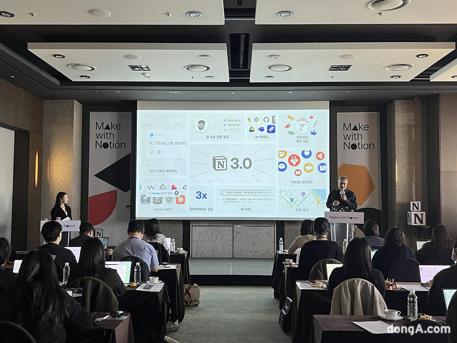 존 헐리 노션 제품마케팅 총괄이 노션 3.0 주요 특징과 기능을 소개하고 있다.간담회에서는 노션 AI 에이전트가 실제로 업무를 수행하는 과정을 시연으로 보여줬다. 고객 피드백을 분석해 서비스를 개선해야 하는 업무에서 노션 AI 에이전트는 슬랙 대화, 노션 메일, 웹 페이지 등 다양한 출처에서 관련 인용구를 자동으로 추출하고 이를 보고서 형태로 수십 초 만에 정리했다. 정리한 내용을 회사 양식에 맞춘 보고서로 완성하는 기능도 구현했다. 이후에는 세부 업무를 분류해 담당자에게 배정까지 했고 필요한 차트와 수식까지 자동으로 생성하는 기능까지 보여줬다. 사용자 의도에 맞춰 실제 업무 흐름을 부드럽게 이어가면서 한 명의 팀원처럼 데이터를 완성하는 모습이 인상적이다.
