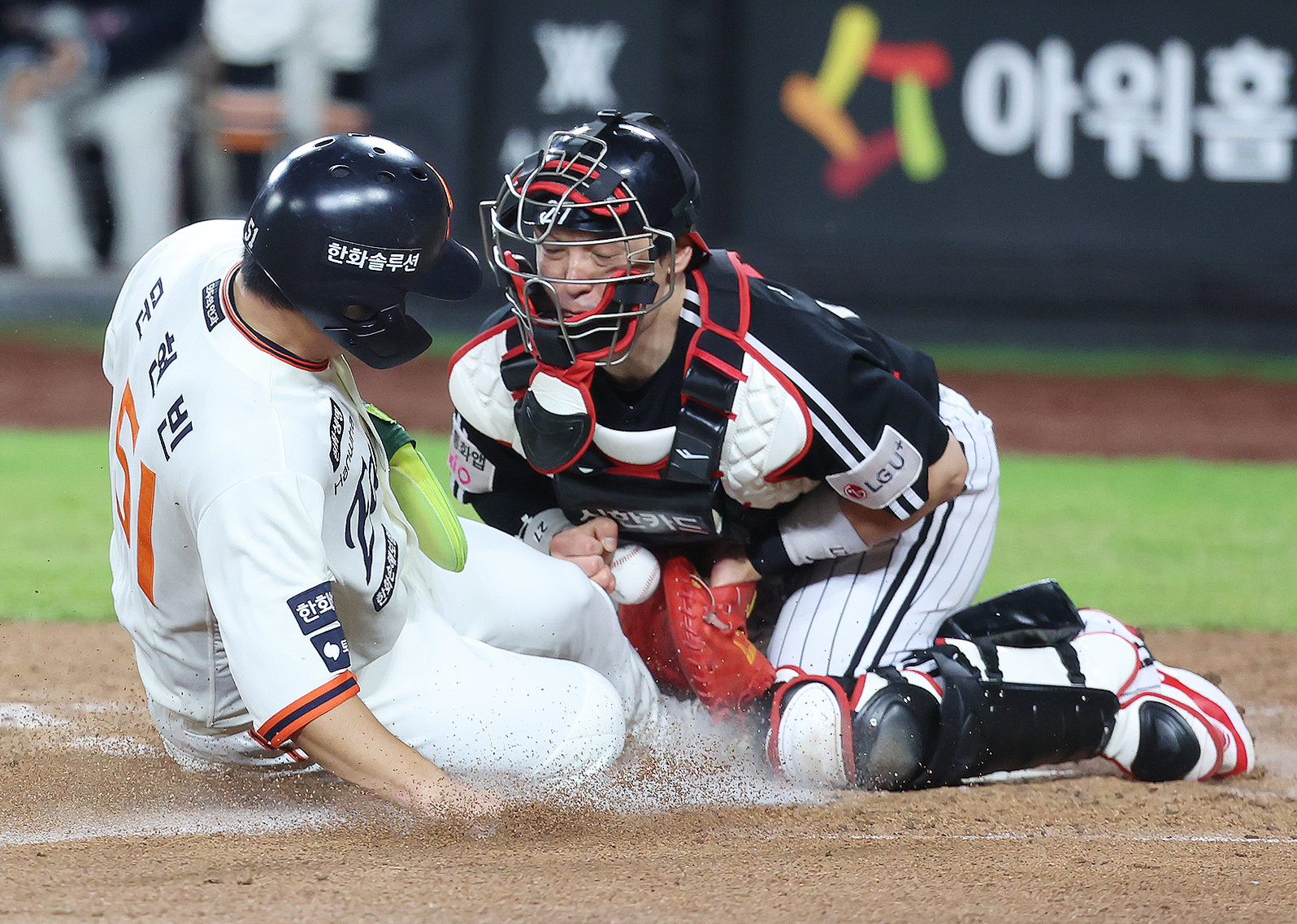 29일 대전 중구 한화생명볼파크에서 열린 2025 KBO리그 LG 트윈스와 한화 이글스의 경기, 한화 3회말 공격 2사 주자 2루 노시환의 안타 때 2루 주자 문현빈이 홈으로 슬라이딩하며 득점하고 있다. 한화 비디오 판독 요청으로 아웃판정에서 LG 포수 박동원의 포구 실책에 따른 득점으로 정정됐다. 2025.09.29 뉴시스