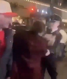 지나가던 시민들이 제지를 하던 중 나치 복장의 한 남성은 손에 들고 있던 맥주병으로 자신에 항의하던 한 여성의 얼굴을 가격했다. 가격을 당한 여성은 고통스러운 듯 고객를 숙이고 얼굴을 감쌌다. 여성은 해당 공격으로 코뼈가 부러진 것으로 알려졌다.