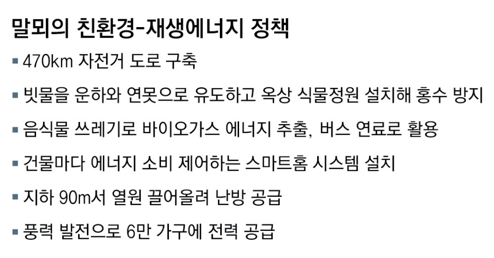 말뫼는 위기 탈출을 위해 친(親)환경, 재생에너지 전문 도시로의 변신에 주력했다. 470km의 자전거 전용 도로를 만들었다. 음식물 쓰레기를 소각하는 과정에서 발생하는 바이오가스, 지하에 있는 자연열을 펌프로 끌어올려 각각 버스 운행, 난방 원료로 쓴다. 풍력 발전도 속속 설치했다.