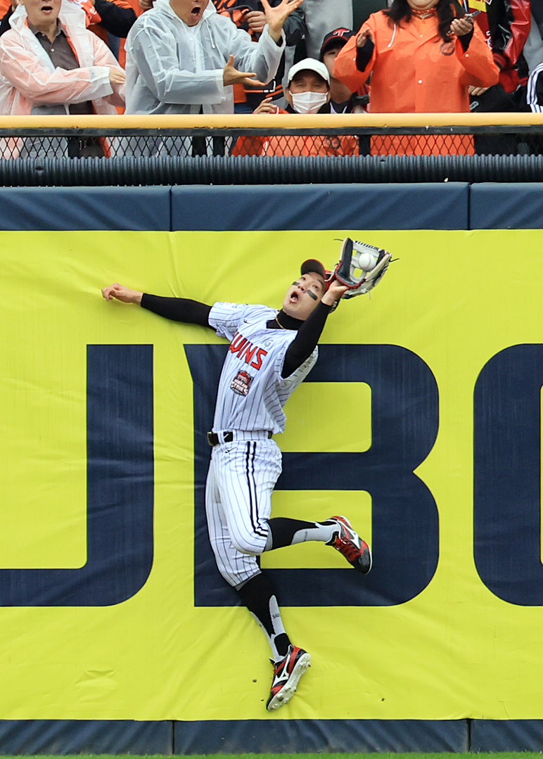 플레이오프 5경기에서 타율 0.444(18타수 8안타), 2홈런, 10타점을 올린 문현빈은 한국시리즈 첫 타석에서도 가운데 담장을 향해 시속 165.8km로 뻗어 가는 타구를 날렸다. 3루 관중석을 가득 채운 한화 팬들은 홈런을 예감한 듯 함성을 질렀다. 그러나 중견수 자리엔 타 팀 팬들이 ‘홈런 절도범’이라 부르는 박해민이 있었다. 박해민은 타구가 뜨자마자 담장을 향해 뛰기 시작해 125m를 날아온 이 타구를 점프해 잡아냈다. 프로야구 10개 팀 안방구장 가운데 외야 담장이 가장 멀리 있는 잠실이 아니었다면 가뿐히 홈런이 되고도 남을 타구였다.