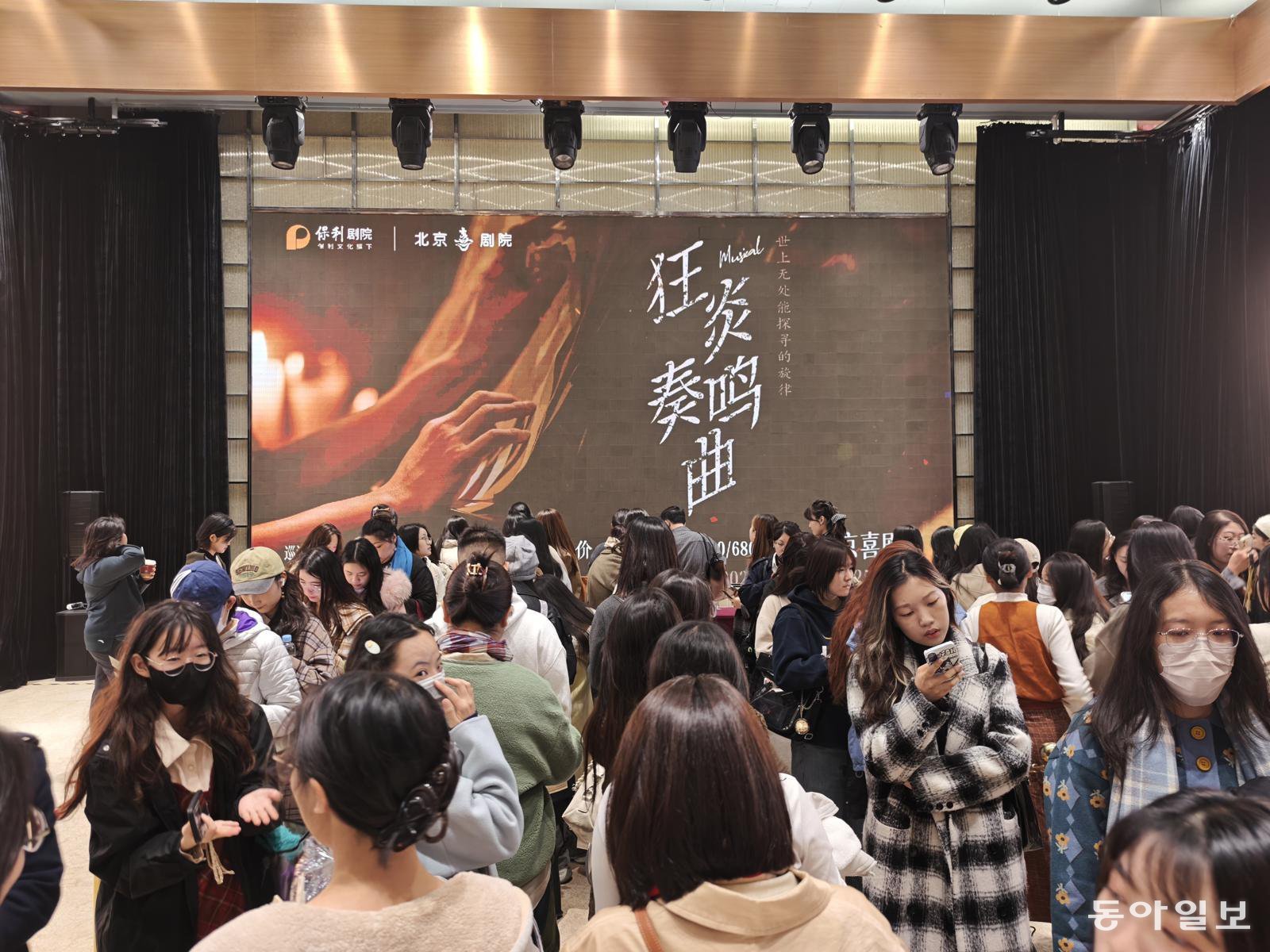 25일 베이징 둥청구의 베이징희극원에서 한국 창작뮤지컬 ‘광염소나타’ 라이선스 공연을 보러 온 관객들이 긴 줄을 서있다. 광염소나타는 지난달부터 상히아, 톈진, 베이징 등 중국 10여개 도시에서 전국 투어 공연을 진행중이다. 베이징=김철중 특파원 tnf@donga.com