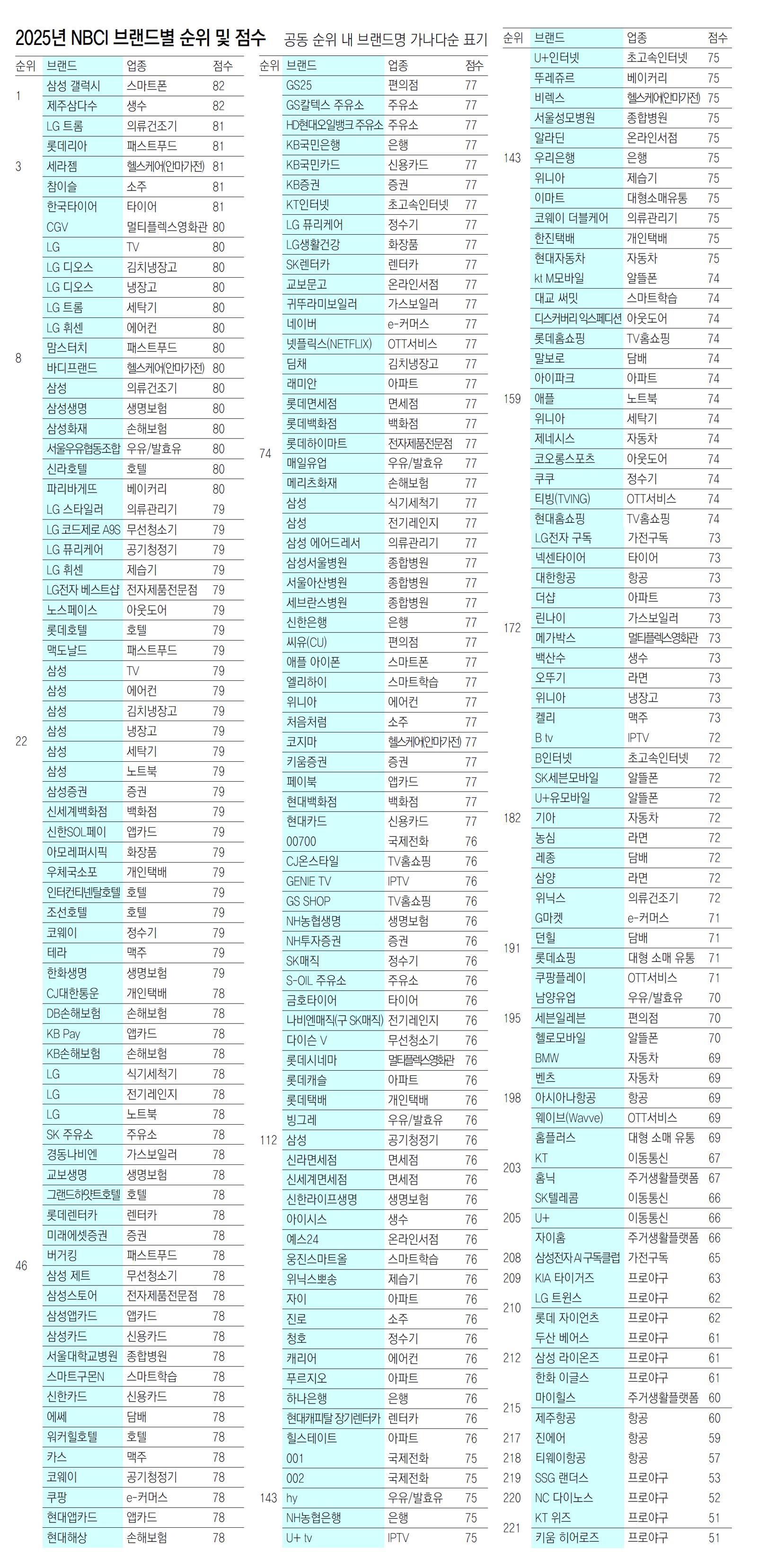 공동 3위에는 81점을 받은 LG트롬(의류건조기), 롯데리아(패스트푸드), 세라젬(헬스케어), 참이슬(소주), 한국타이어(타이어)가 이름을 올렸다. 롯데리아와 한국타이어는 지난해 나란히 공동 20위에 자리했지만, 올해 순위를 크게 높였다.