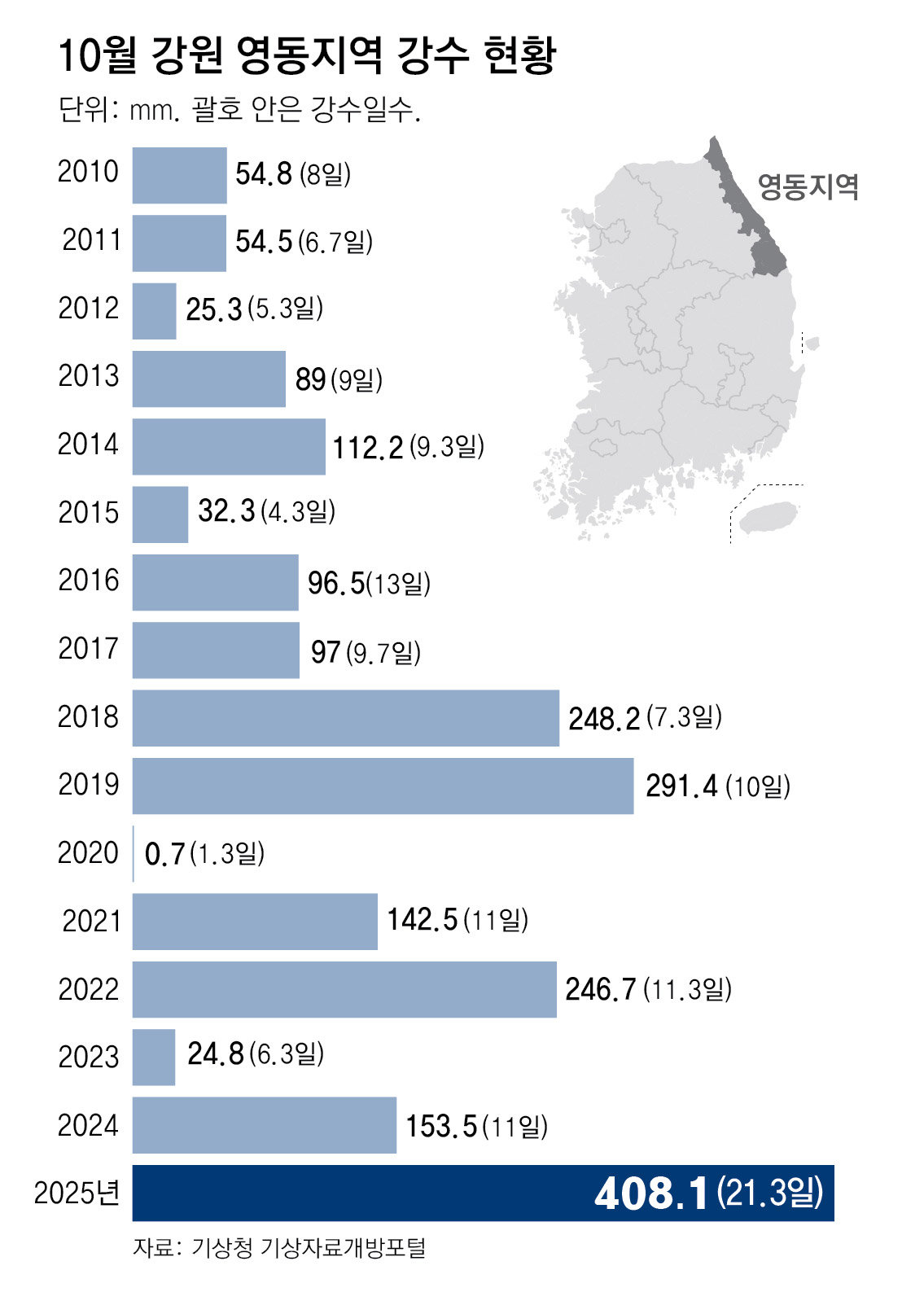 27일 기상청 기상자료개방 포털에 따르면 올해 10월 1일부터 이날까지 강원 영동 지방의 평균 강수량은 408.1mm로 1973년 기상 관측이 체계화된 이래 가장 많았다. 두 번째로 강수량이 많았던 해인 2019년 291.4mm와 비교할 때 1.5배가량으로 많다. 강수일 역시 평균 21.3일로 역대 가장 길다. 이달 3∼25일 강원 영동 지방에는 하루도 쉬지 않고 비가 내렸다. 단풍철을 맞아 개막한 강원도 대표 가을 축제도 10월 장마로 방문객이 감소하는 등 상당한 피해를 보았다.