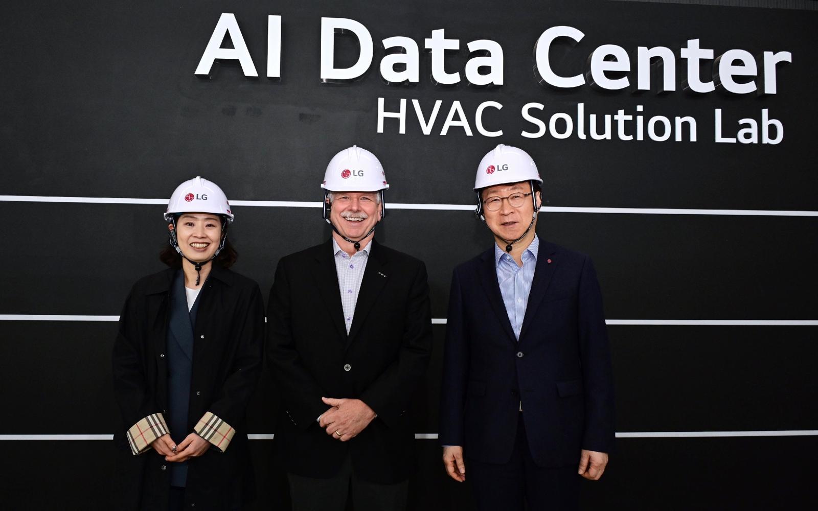 LG전자가 AI 데이터센터 냉각솔루션 포트폴리오를 액침냉각 방식까지 확장하기 위해 SK엔무브, 美 액침냉각 전문기업 GRC와 ‘AI 데이터센터 냉각솔루션 사업 확대를 위한 업무협약’을 체결했다고 28일 밝혔다. SK엔무브 남재인 Green성장본부장(왼쪽부터), GRC 피터 폴린(Peter Poulin) CEO, LG전자 이재성 ES사업본부장이 LG전자 칠러사업장 내 구축된 AI 데이터센터 전용 테스트베드에서 기념 촬영을 하고 있다. 2025.10.28. LG전자 제공