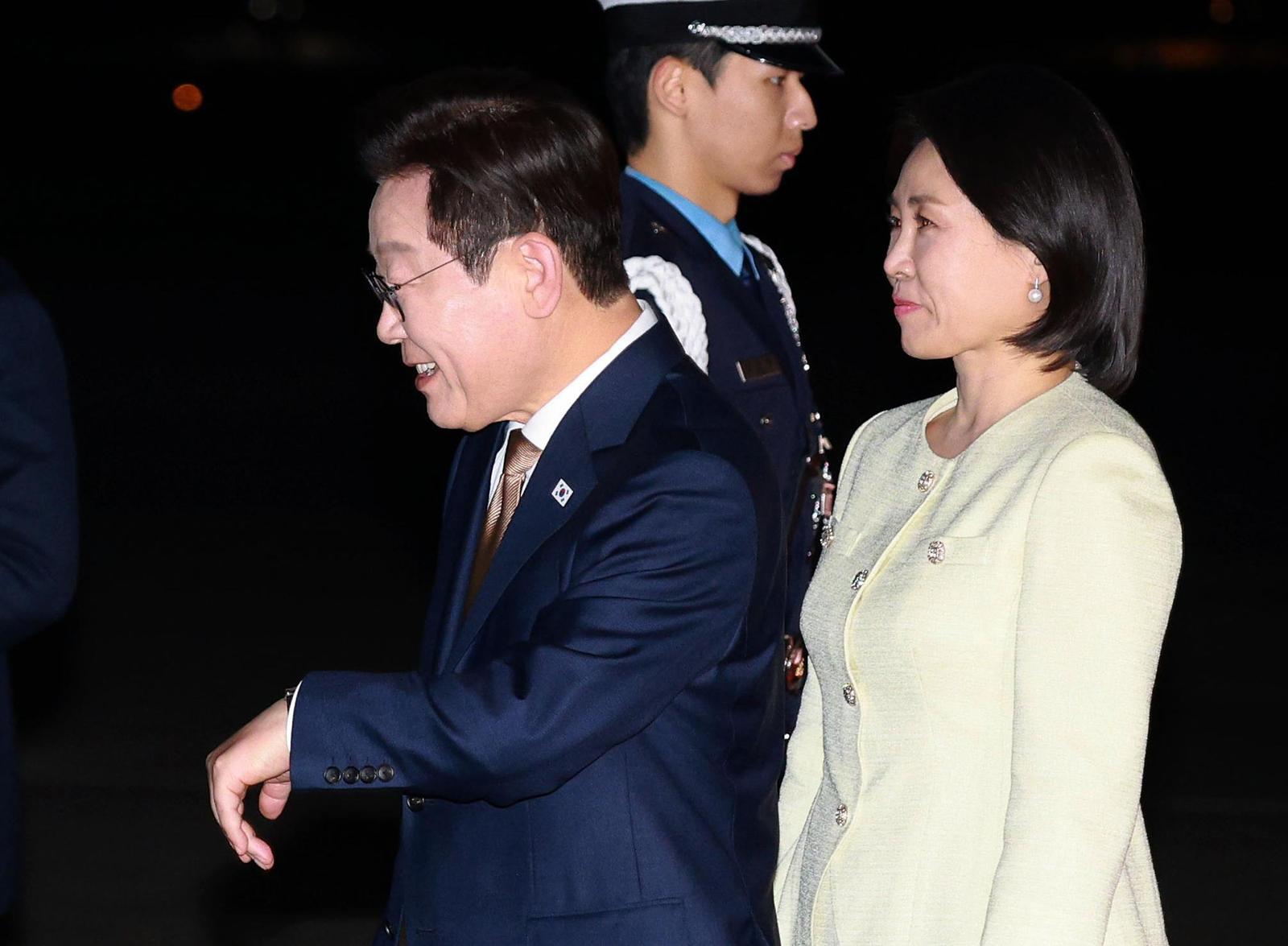 이재명 대통령과 김혜경 여사가 동남아시아국가연합(ASEAN·아세안) 정상회의 일정을 마치고 27일 오후 경기 성남시 서울공항으로 귀국해 이동하고 있다. 이 대통령은 28일 경북 경주로 이동해 29일 열리는 도널드 트럼프 미국 대통령과의 정상회담을 준비했다. 성남=뉴시스