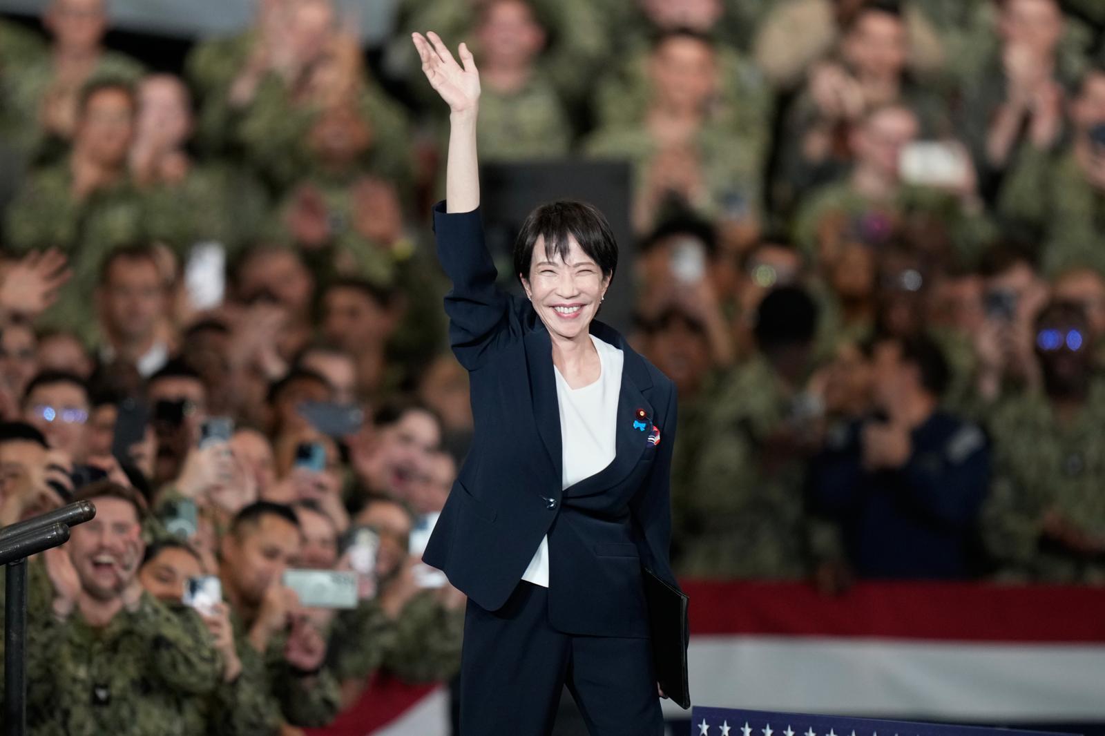 다카이치 사나에 일본 총리가 28일 도쿄 인근 요코스카 해군기지에 정박한 미국 항공모함 ‘조지워싱턴’함의 갑판에서 환호하는 장병들에게 손을 흔들며 웃고 있다. 요코스카=AP 뉴시스