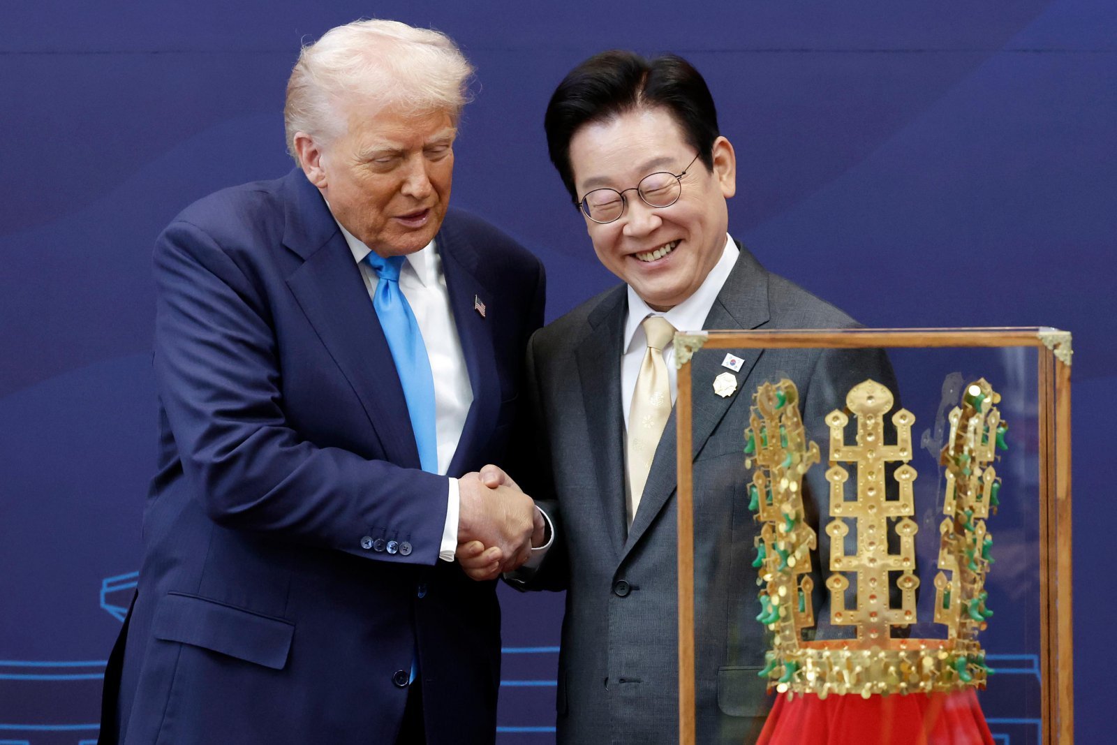 이재명 대통령이 29일 경북 경주박물관에서 도널드 트럼프 미국 대통령에게 ‘천마총 금관 모형’을 선물하고 있다. 뉴시스