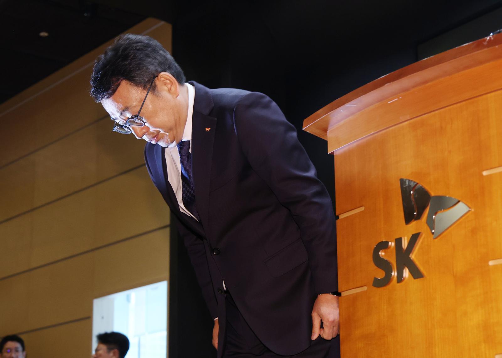 유영상 SK텔레콤 사장 등 임원들이 25일 서울 중구 을지로 SKT타워 수펙스홀에서 열린 기자간담회에서 USIM해킹 사태와 관련해 사과하고 있다.