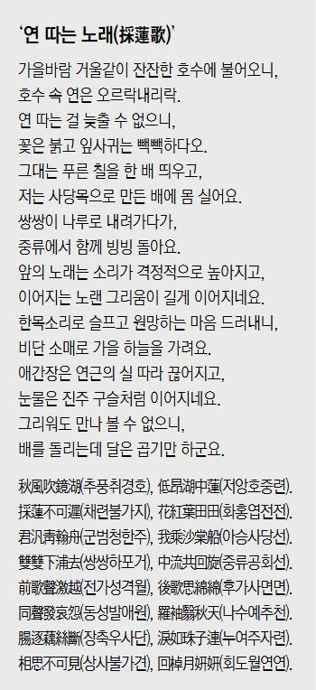 치치가 연극을 어떻게 풀어가야 하는지 잘 알고 있었던 것처럼, 위 시도 전통적인 ‘연 따는 노래’란 주제를 능숙하게 소화해 펼쳐낸 사례다. 연을 따는 것은 본래 중국 강남지방의 옛 풍속인데, 시 속의 이미지와 모티프들은 모두 ‘연 따는 노래’(‘江南’, ‘採蓮曲’ 등)의 전형들을 솜씨 좋게 재구성한 것이다. 시인은 연 따는 여성에게 은연중 자신의 감정을 투영한 듯하지만 그것이 정확히 어떤 의중인지는 알 수 없다. 다만 여성의 목소리로 임에 대한 그리움을 아련하게 노래한 시인의 과거가 무뢰한이었단 사실은 그 자체로 흥미롭다.