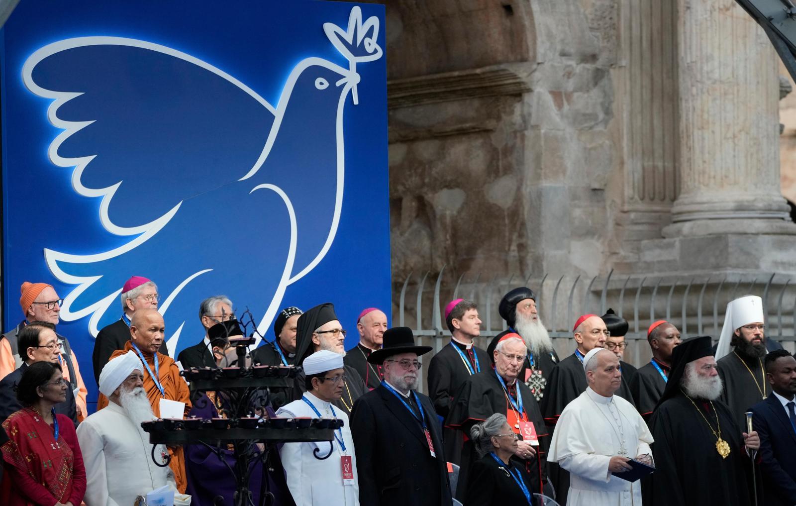 레오 14세 교황(앞줄 오른쪽에서 세 번째)이 28일 이탈리아 로마 콜로세움 앞에서 열린 세계 평화를 기원하는 종교 간 회의에 참석했다.