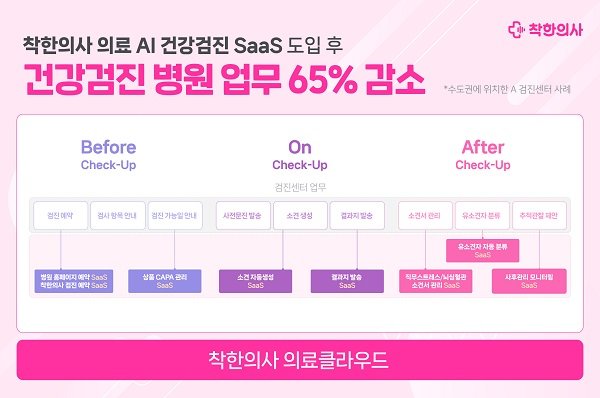 착한의사 의료 AI 건강검진 SaaS는 건강검진 여정에 따라 CMS(검진예약 관리)와 PMS(추적관찰 관리) 두 가지 솔루션으로 구성되며, 국가·종합·특수검진 등 병원별 업무 특성에 맞춰 필요한 기능을 선택적으로 도입할 수 있다. 초기 구축비용 없이 정기 구독형 요금제로 제공돼 병원은 손쉽고 유연하게 도입할 수 있다.