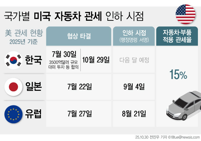 앞서 미국은 지난 7월22일 일본과 관세 협상을 합의한 뒤 약 한 달 반 만에 도널드 트럼프 미국 대통령이 행정명령에 서명하면서 25%로 적용되던 자동차와 부품에 대한 관세를 15%로 낮췄다.