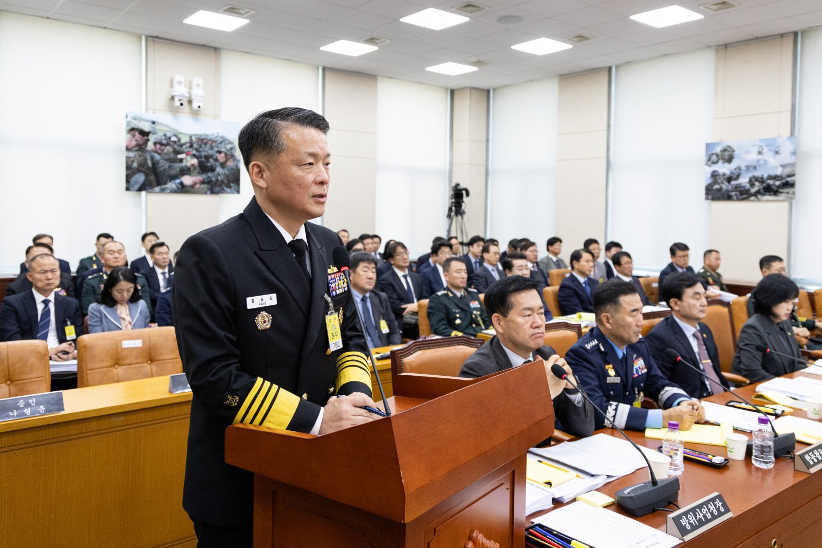 강동길 해군참모총장이 30일 서울 여의도 국회에서 열린 국방위원회 국방부 등에 대한 국정감사에 출석해 의원 질의에 답변하고 있다. 뉴스1