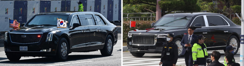 달리는 백악관 vs 중국판 롤스로이스 30일 김해공항에 모습을 드러낸 도널드 트럼프 미국 대통령의 리무진 ‘더 비스트’(왼쪽 사진)와 시진핑 중국 국가주석의 리무진 ‘N701’. 경주=홍진환 기자 jean@donga.com·뉴스1