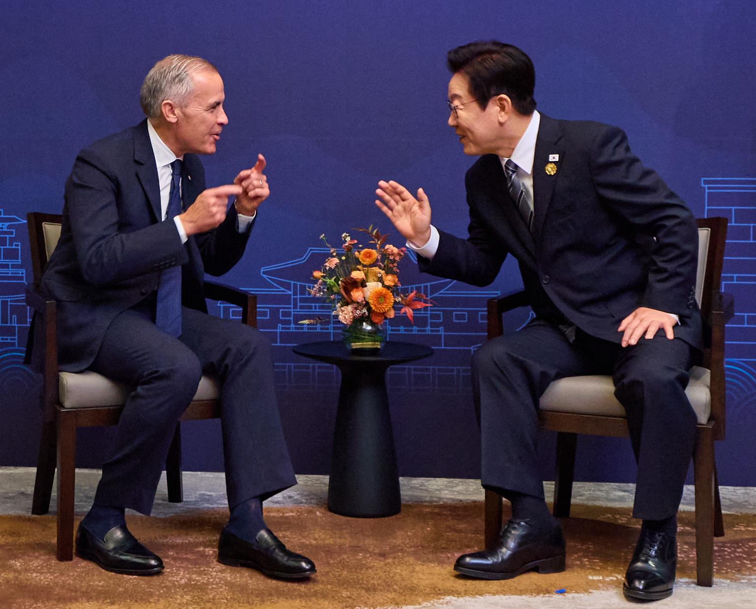 이재명 대통령과 마크 카니 캐나다 총리가 경북 경주의 한 호텔에서 정상회담을 하고 있다. 대통령실 제공