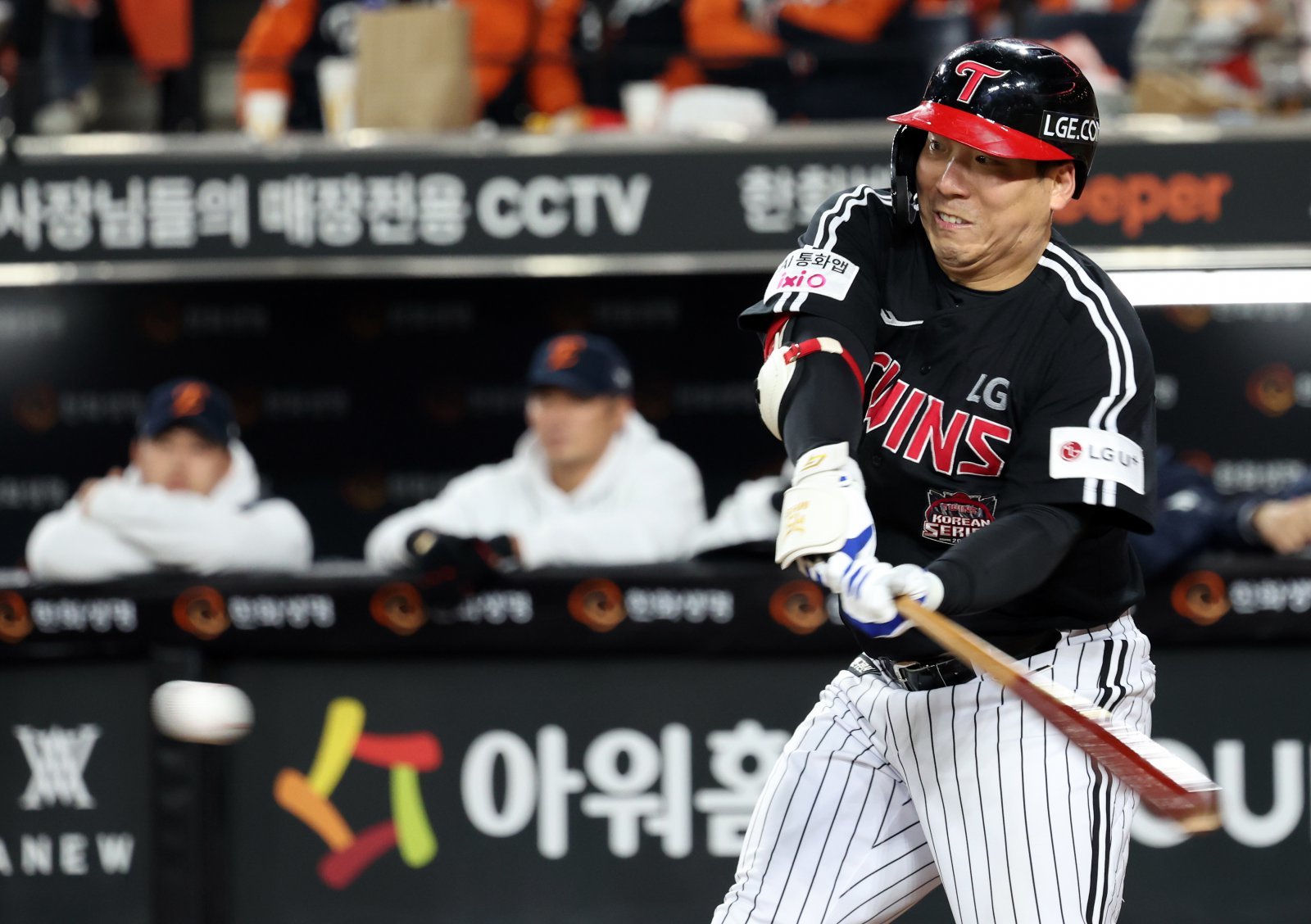 31일 대전 중구 한화생명볼파크에서 열린 2025 KBO 한국시리즈 5차전 LG 트윈스와 한화 이글스의 경기에서 8회초 무사 1루 상황에서 LG 김현수가 안타를 때리고 있다. 2025.10.31 대전=뉴시스