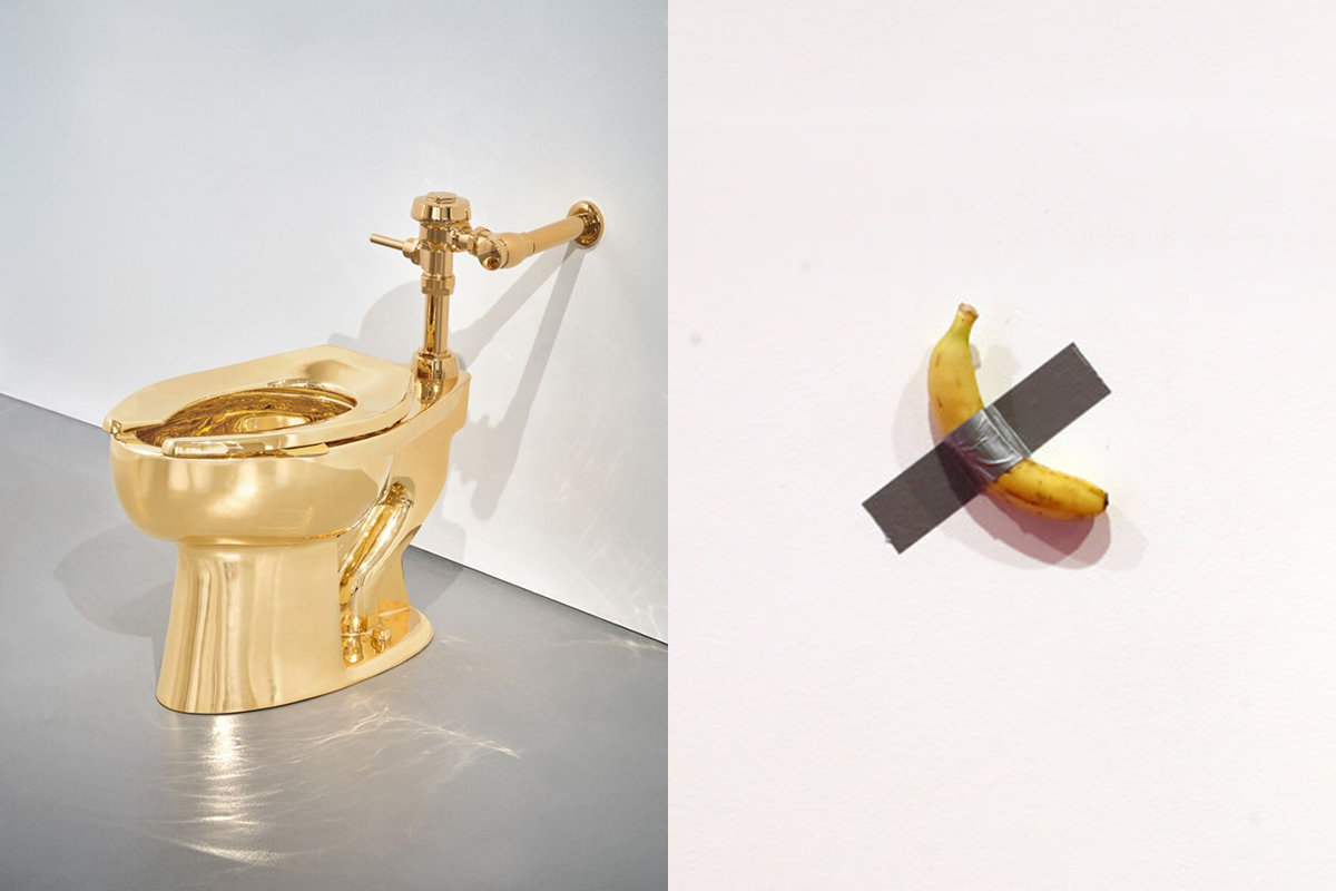 101.2㎏의 황금이 들어간 ‘아메리카’의 모습(왼쪽), 마우리치오 카텔란의 작품 ‘코미디언’.